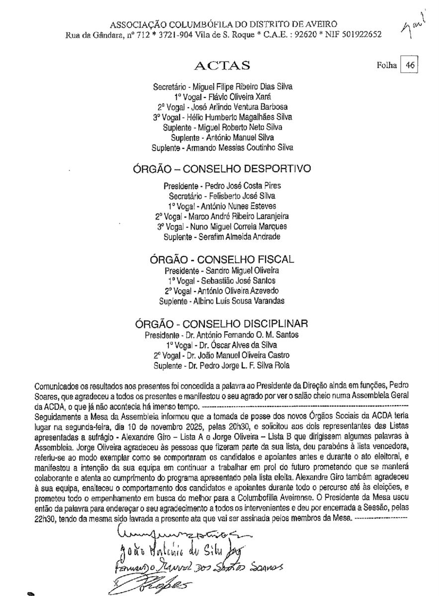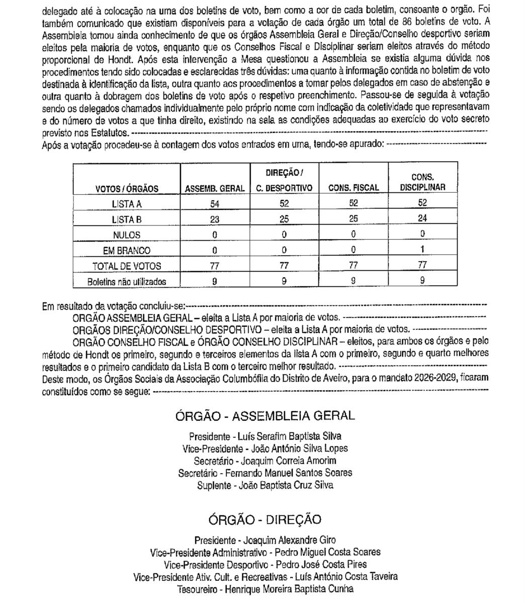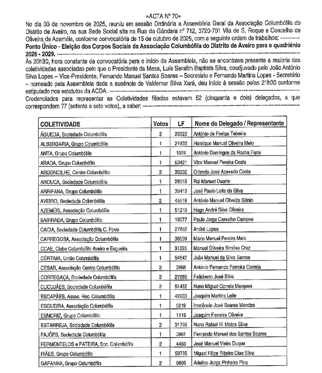 ÓRGÃOS SOCIAIS DA ASSOCIAÇÃO COLUMBÓFILA DO DISTRITO DE AVEIRO