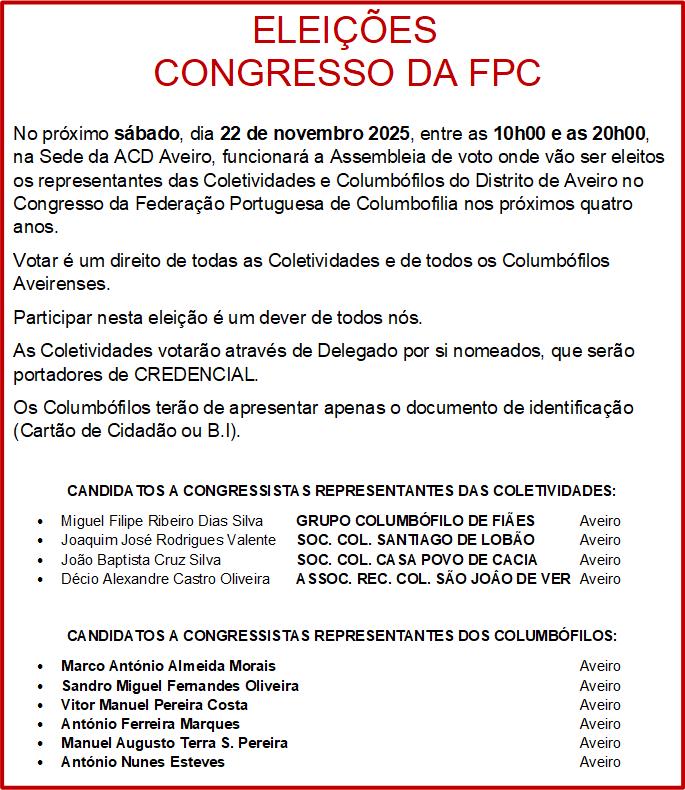 ELEIÇÕES CONGRESSO DA FPC - SÁBADO DIA 22 NOV. 2025, NA SEDE DA ACD AVEIRO 18/11/2025