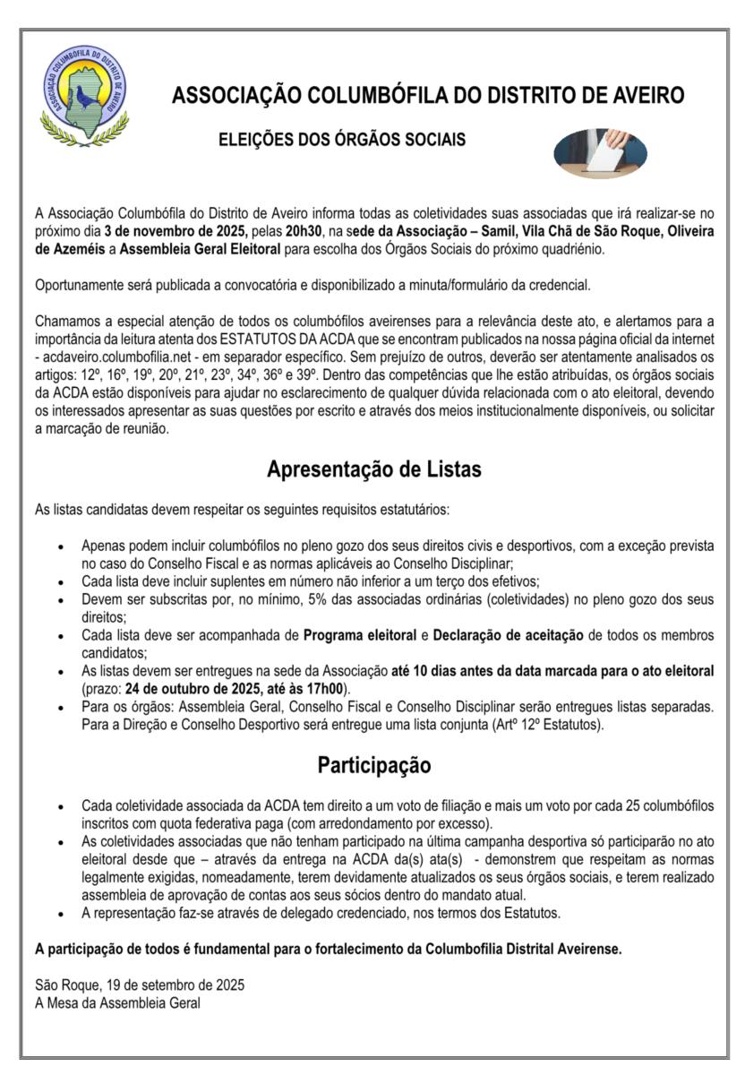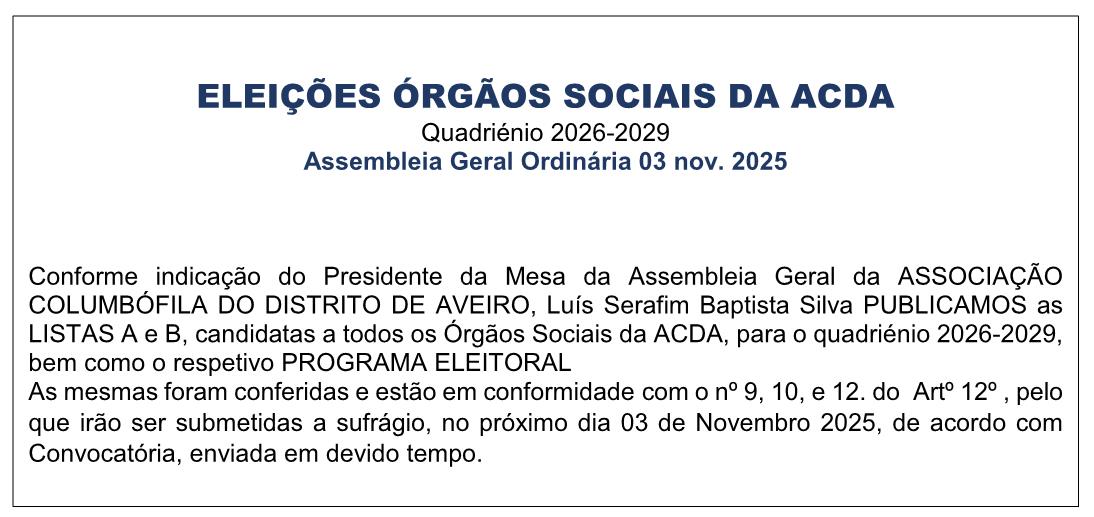 ELEIÇÕES DOS ÓRGÃOS SOCIAIS DA ACDA - 3 NOV.2025 19/09/2025