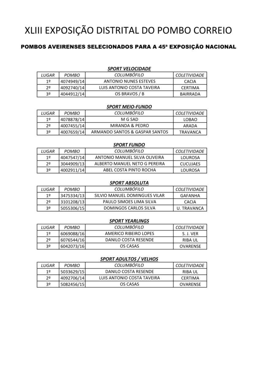 XLIII EXPOSIÇÃO DISTRITAL DO POMBO CORREIO - SELEÇÃO SPORT 18/12/2017