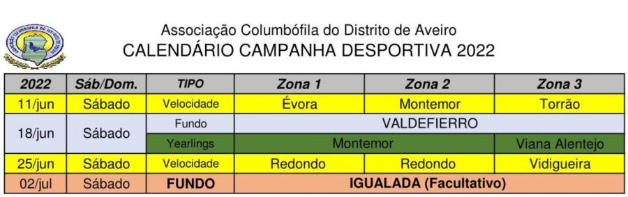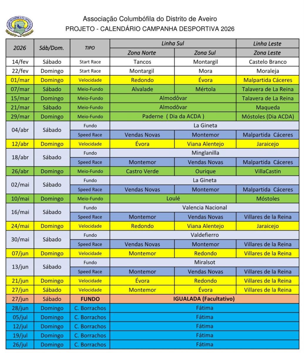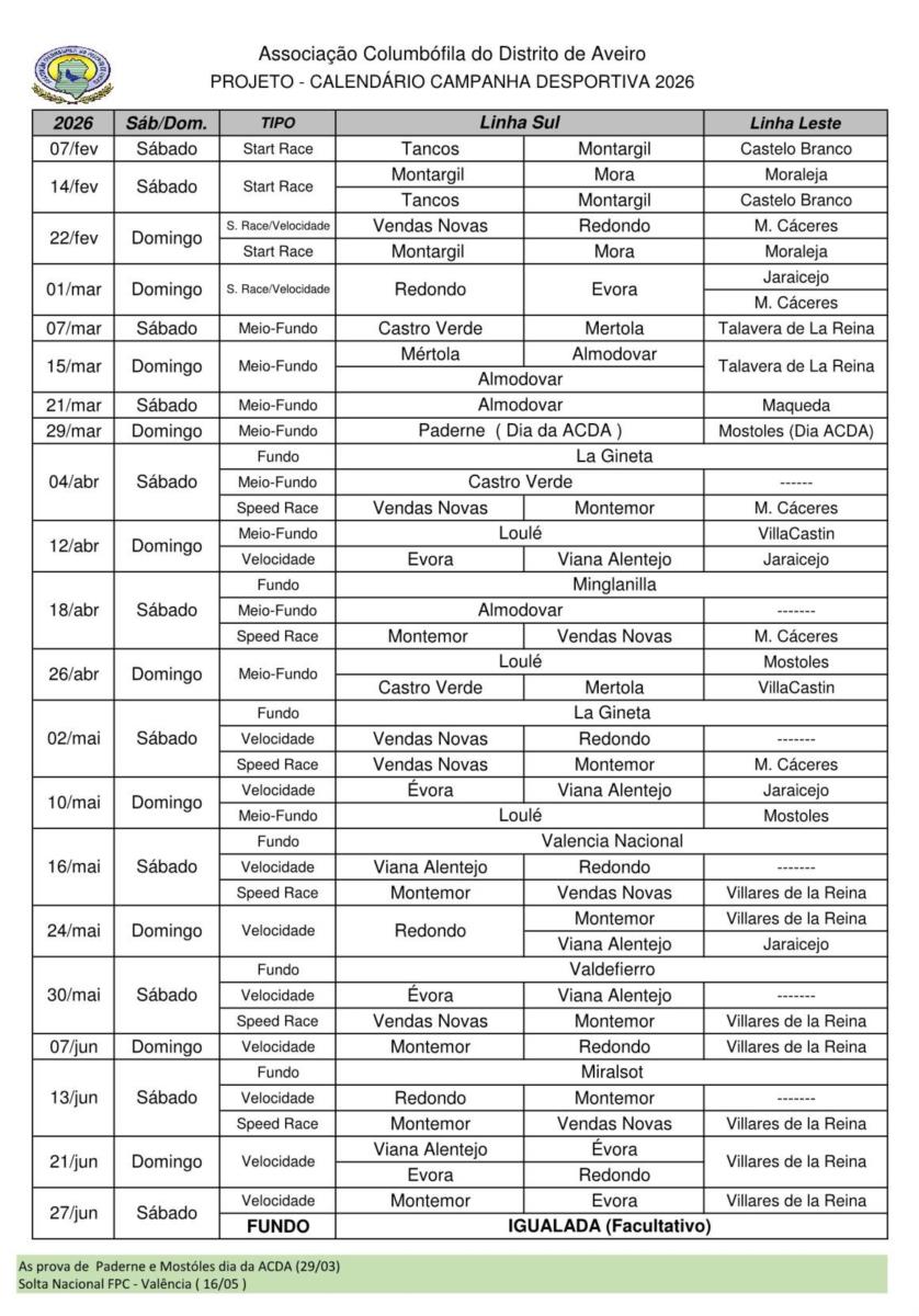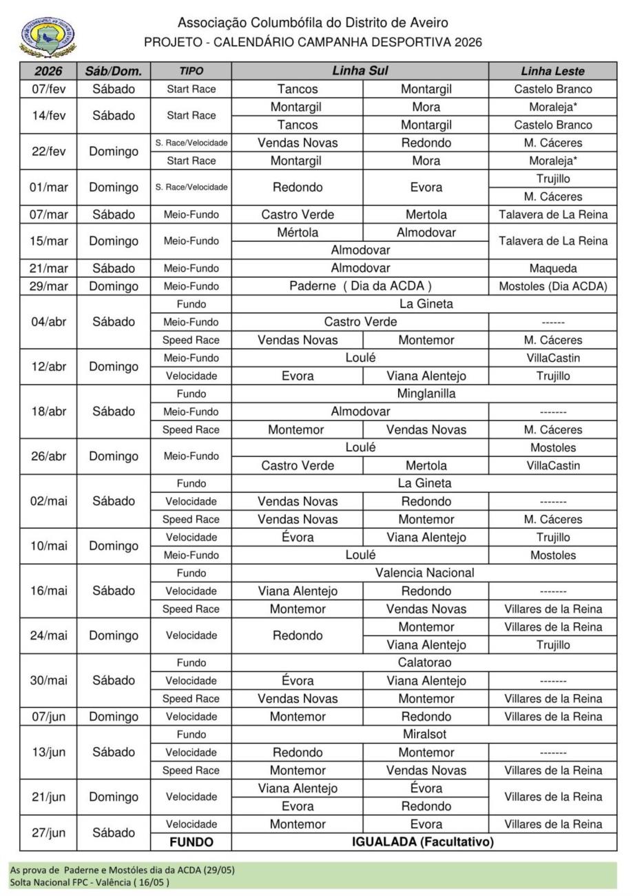 A ACDA apresentou hoje junto da Federação Portuguesa de Columbofilia o projeto de calendário de soltas a seguir transcrito, com vista à obtenção das necessárias autorizações junto das entidades competentes. A partir das soltas que compõe este projeto que vierem a obter autorização e em função dos modelos competitivos que se mostrarem mais adequados, competirá depois aos responsáveis desta Associação, estabelecer e publicar a versão definitiva do calendário desportivo para 2026.
