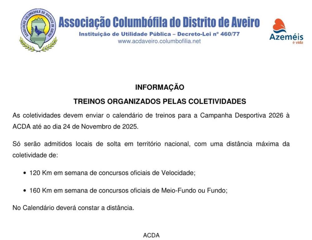 INFORMAÇÃO - CALENDÁRIOS TREINOS ORGANIZADOS PELAS COLETIVIDADES 11/11/2025