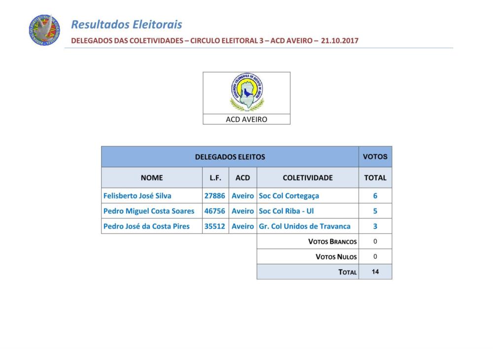 RESULTADOS ELEIÇÕES DELEGADOS AO CONGRESSO DA FPC - DISTRITO DE AVEIRO 24/10/2017