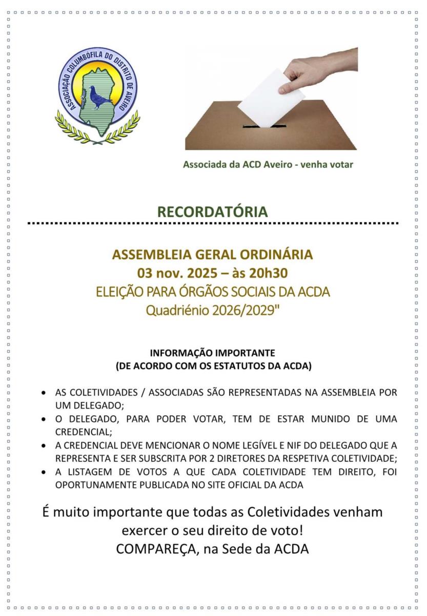 RECORDATÓRIA - A. G. O. DIA 03 NOV. 2025 (SEGUNDA-FEIRA)- ELEIÇÕES ÓRGÃOS CORPOS SOCIAS DA ACDA 31/10/2025