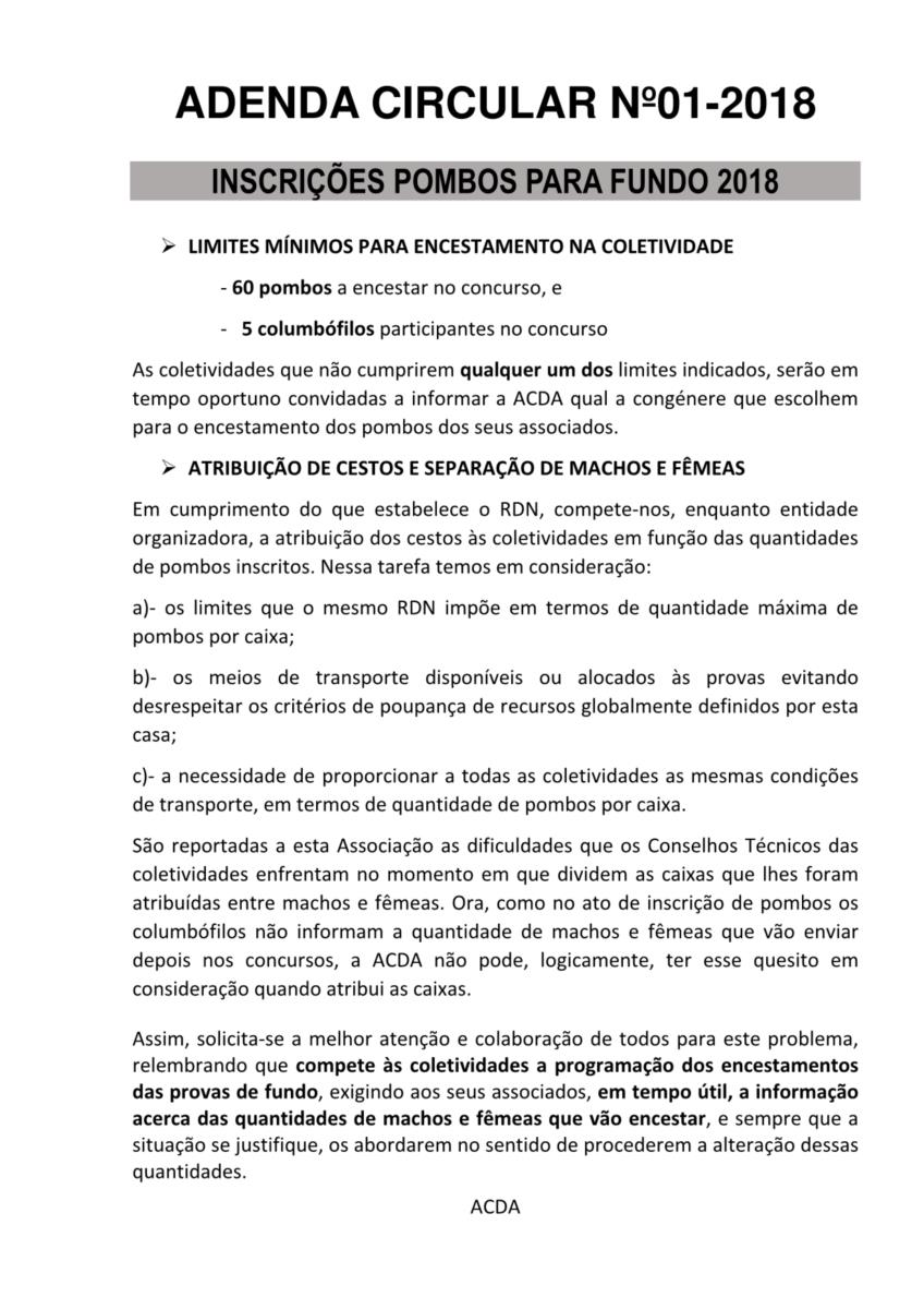 De acordo com a informação que nos foi transmitida pela Direção da FPC, cumpre-nos informar que na Campanha Desportiva 2018, a intenção dos columbófilos em concursar no distrito vizinho ficará sujeito ao estabelecido no nº 7 do Art.º 3 do RDN, que prevalecerá sobre qualquer acordo que tenha estado em vigor.