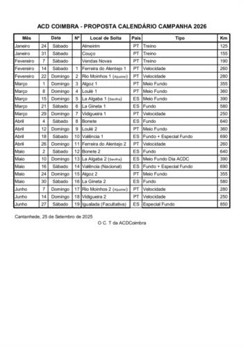 O Calendário reformulado está disponível para consulta na secção «Calendário de Provas». Lembramos que a Prova de MINGLANILLA também conta para o Campeonato de Grande Meio-Fundo. A Prova seguinte será de Meio-Fundo, com Solta de ALCABON, na qual se irá disputar a Meia-Final da Taça ACD Coimbra.