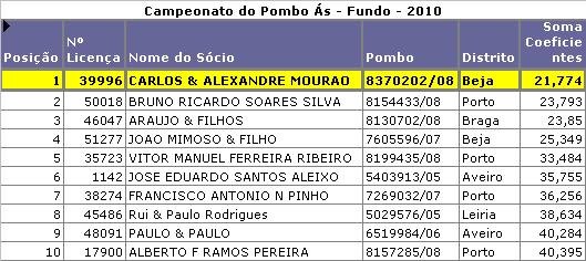 | Mais um grande feito do nosso socio - CARLOS & ALEXANDRE MOURAO - CAMPEÃO NACIONAL pombo ÁS 2010 - FUNDO | 01/02/2011 |