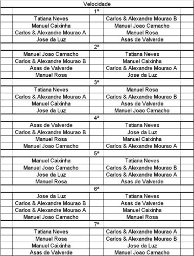 VELOCIDADE 1ª Eliminatoria - 2010/05/01 - Siruela II 1 - Jose da Luz - Manuel Rosa 2 - Manuel Joao Camacho - Manuel Caixinha 3 - Manuel Rosa B - Duarte & Avô 4 - Tatiana Neves - Carlos & Alexandre Mourão 5 - Luis Parreira - Asas Valverde ************************************ 2ª Eliminatoria - 2010/05/15 - Talarrubias II 1 - Vencedor 4 - Vencedor 3 2 - Vencedor 1 - Vencedor 2 Isento: vencedor 5 Final - 2010/05/29 - Siruela III Vencedores 1 e 2 + Isento |