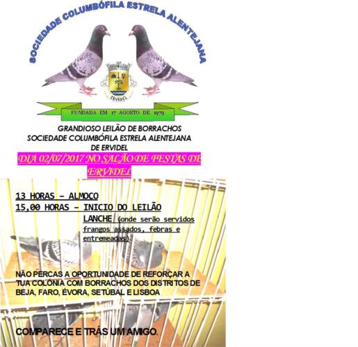 Em nome da SOCIEDADE COLUMBÓFILA ESTRELA ALENTEJANA de ERVIDEL, vimos por este meio agradecer a todos os que contribuíram (ofertantes, compradores e todos os colaboradores) para a realização de mais um grandioso leilão de borrachos, no dia de hoje, 30 de junho. Aproveitamos para informar, que o pombo 2444650/12 sorteado no final do leilão, saiu ao nº 298, como o portador do referido bilhete já não se encontrava presente, vamos aguardar que o possa apresentar e receber o pombo sorteado. |