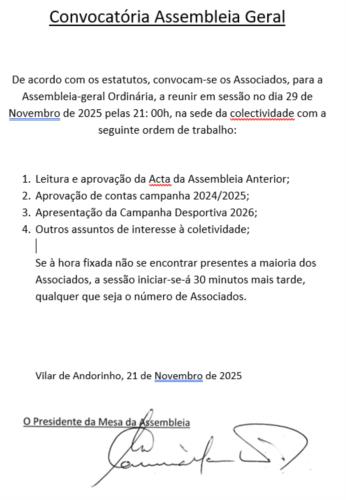 Convocatória Assembleia Geral De acordo com os estatutos, convocam-se os Associados, para a Assembleia-geral Ordinária, a reunir em sessão no dia 29 de Novembro de 2025 pelas 21: 00h, na sede da colectividade com a seguinte ordem de trabalho: 1. Leitura e aprovação da Acta da Assembleia Anterior; 2. Aprovação de contas campanha 2024/2025; 3. Apresentação da Campanha Desportiva 2026; 4. Outros assuntos de interesse à coletividade; Se à hora fixada não se encontrar presentes a maioria dos Associados, a sessão iniciar-se-á 30 minutos mais tarde, qualquer que seja o número de Associados. Vilar de Andorinho, 21 de Novembro de 2025 |